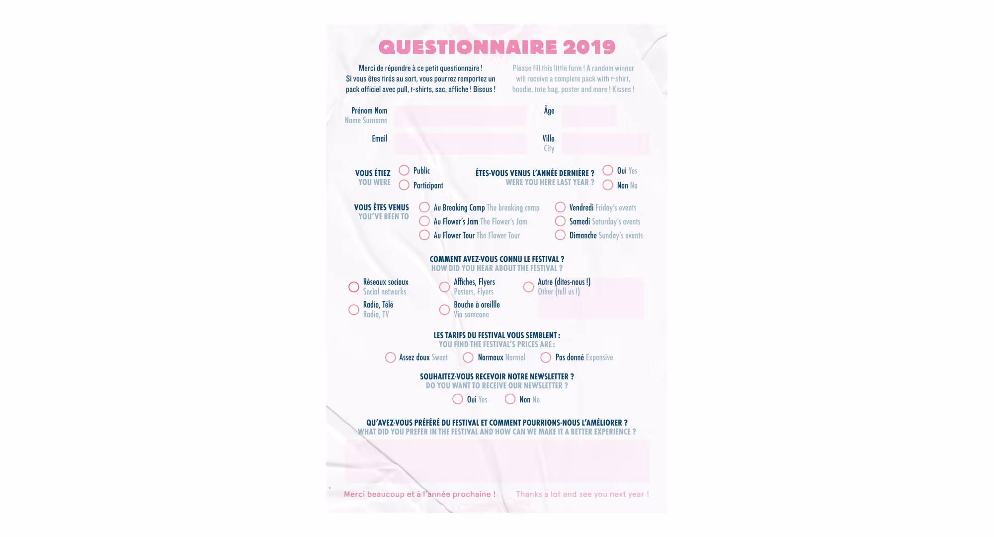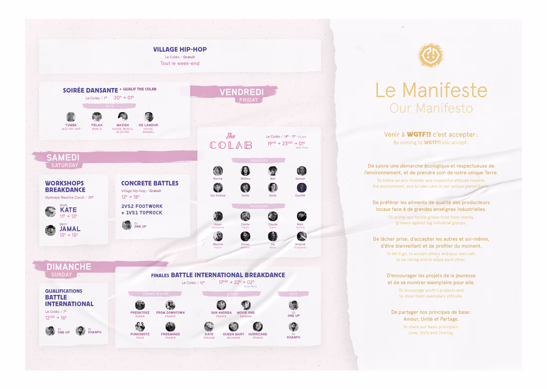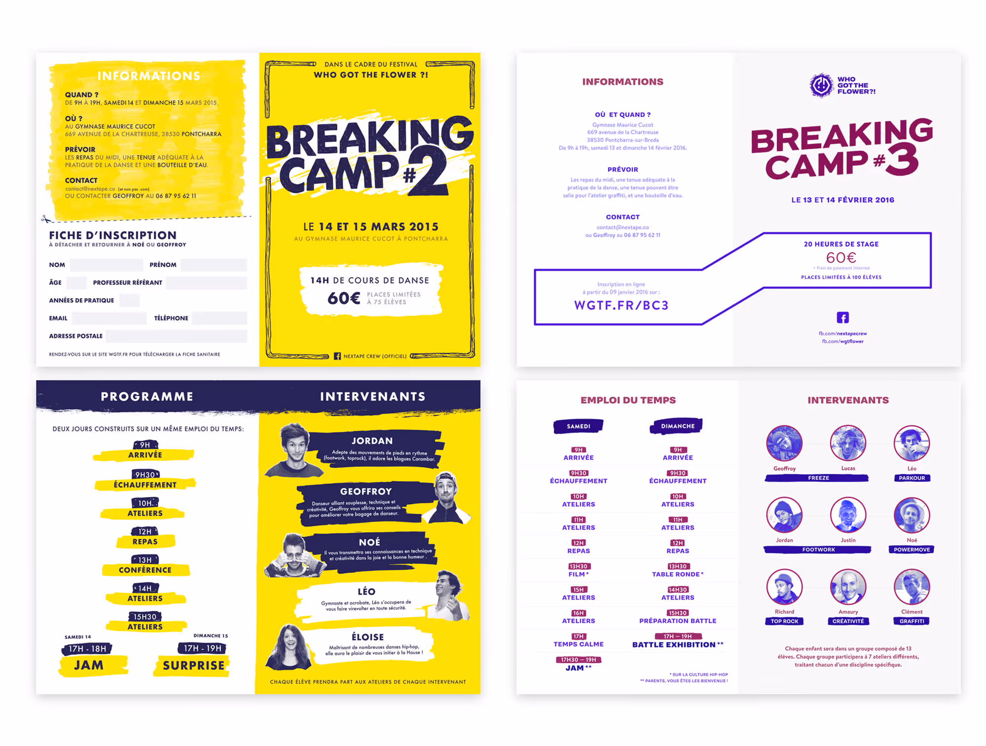 Le festival Who got the flower ?! est un festival de danse hip-hop créé avec mes amis du crew Nextape. Fondé en 2014, j'ai géré jusqu'en 2019 la direction artistique graphique du festival, en créant l'image de marque, en m'occupant du design et de l'intégration pour le web, et en capturant et en éditant les contenus vidéos lors de l'évènement. Ici j'ai compilé quelques supports graphiques que j'ai réalisé. J'ai également géré tout l'univers vidéo du festival.