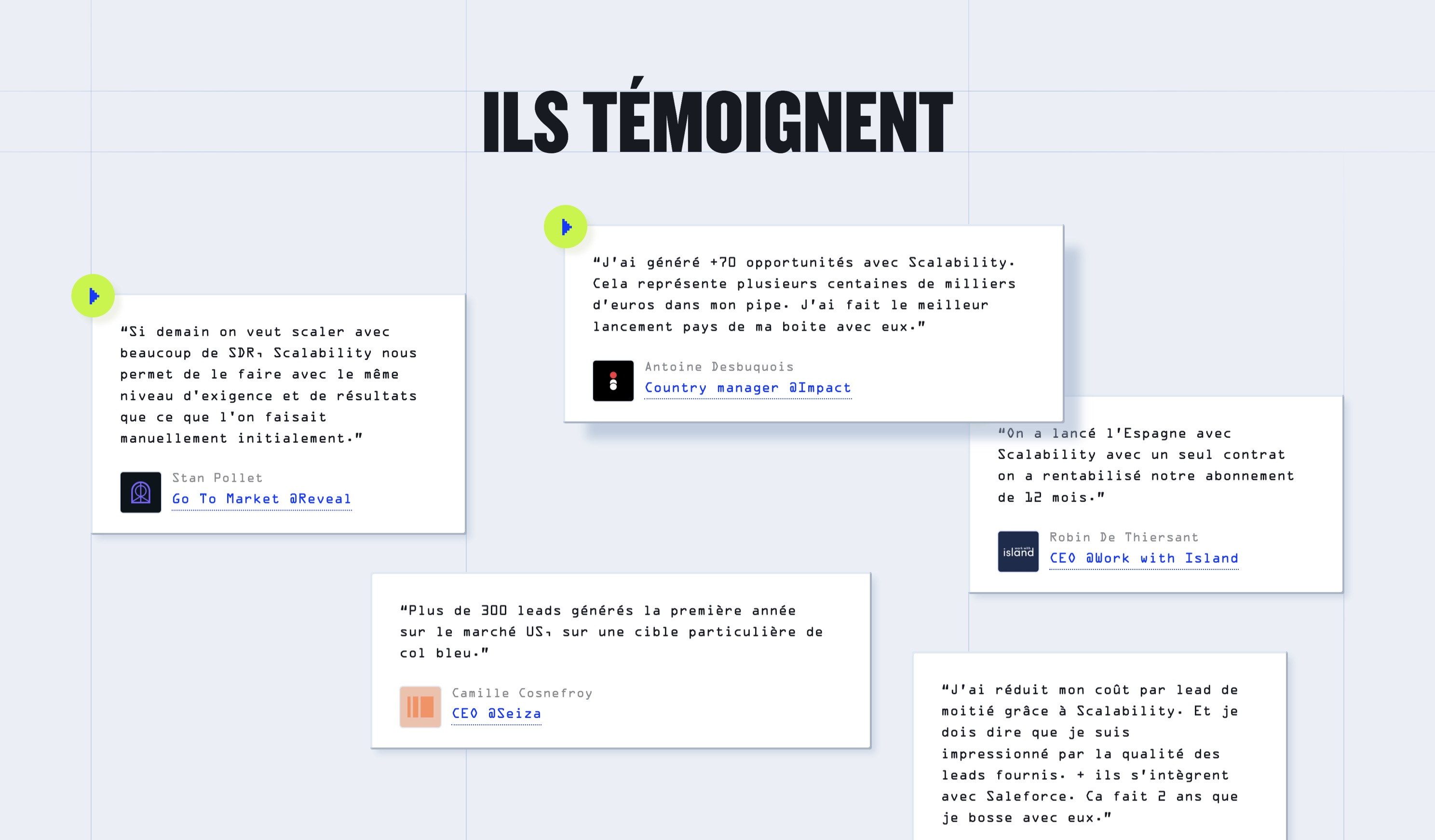 J'ai géré pour Scalability le design et l'intégration complète de leur nouveau site web avec Webflow, en y intégrant des animations qui viennent appuyer la logique d'automatisation. Tout le site reprend la nouvelle brand, avec des layouts sans compromis, et une typo ultra expressive.